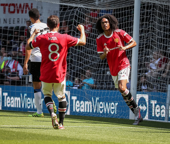 Hollenski sóknarmaðurinn Tahith Chong kom United yfir eftir að hafa unnið boltann af varnarmanni Derby, lyft honum yfir markvörðinn og skorað í netið.