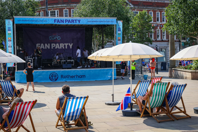 Það var ekki alveg sama partí-stemning á FanZone svæðinu í Rotherham eins og var í leikjunum í Manchester.