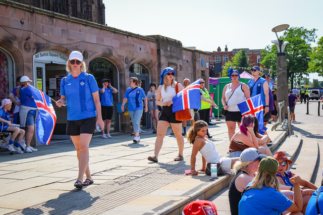 Það er steikjandi hiti í Rotherham borg þar sem íslenskir stuðningsmenn eru að hita upp fyrir leikinn gegn Frakklandi á EM kvenna. Það er 37 stiga hiti (til gamans má geta að á Tenerife er 27 stiga hiti).