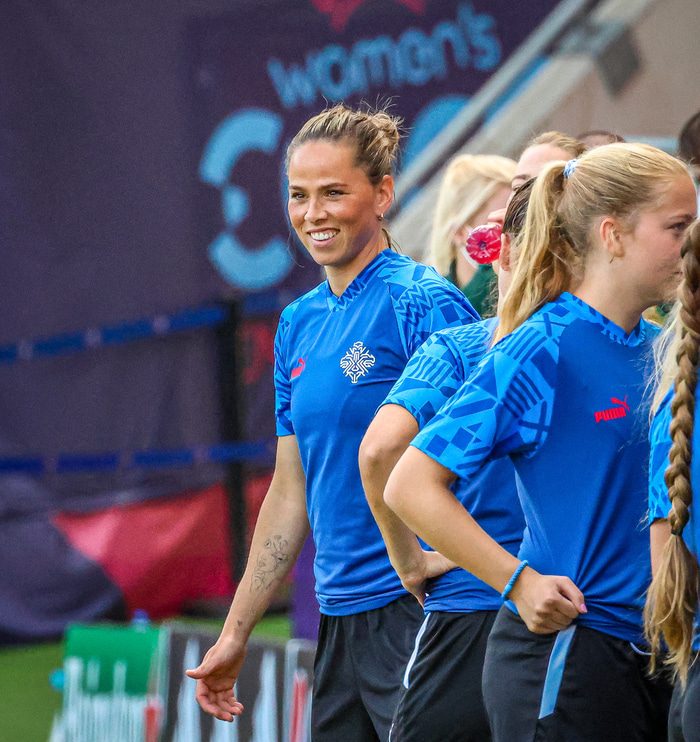 Sara eignaðist sitt fyrsta barn, soninn Ragnar Frank, í nóvember á síðasta ári. Hún er núna mætt aftur út á völl - þar sem henni líklega líður best - að leið íslenska landsliðið.