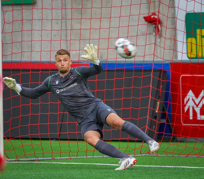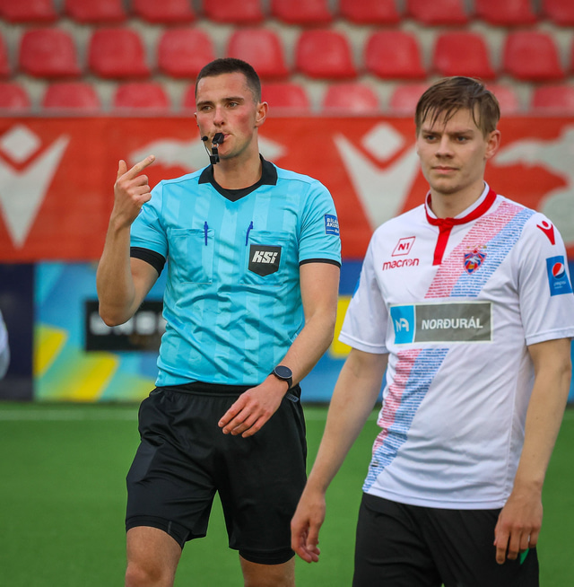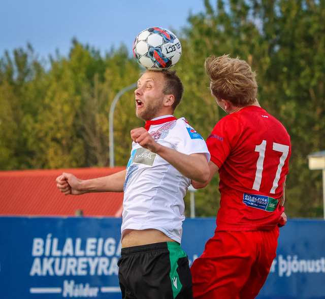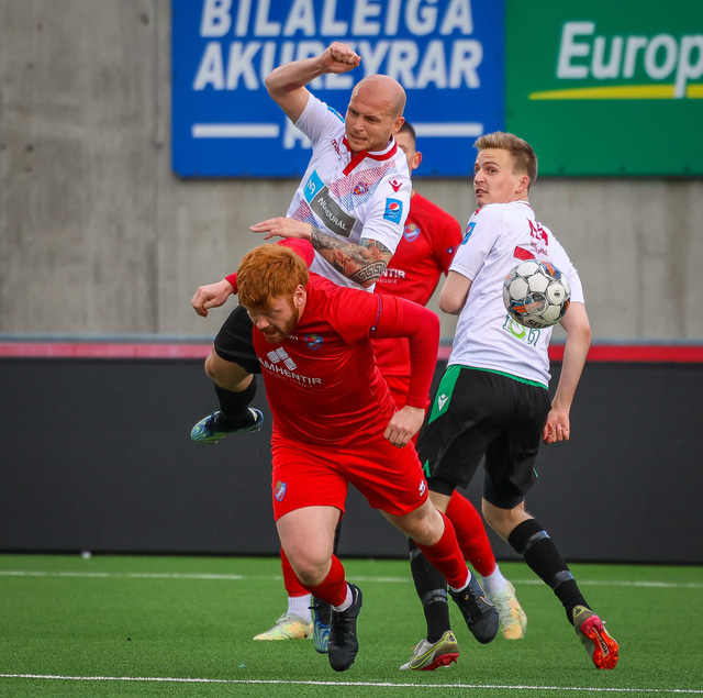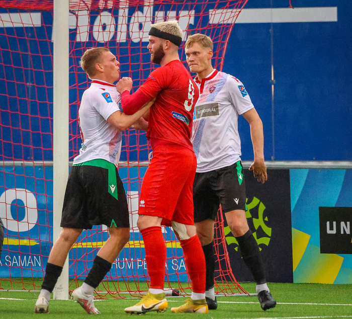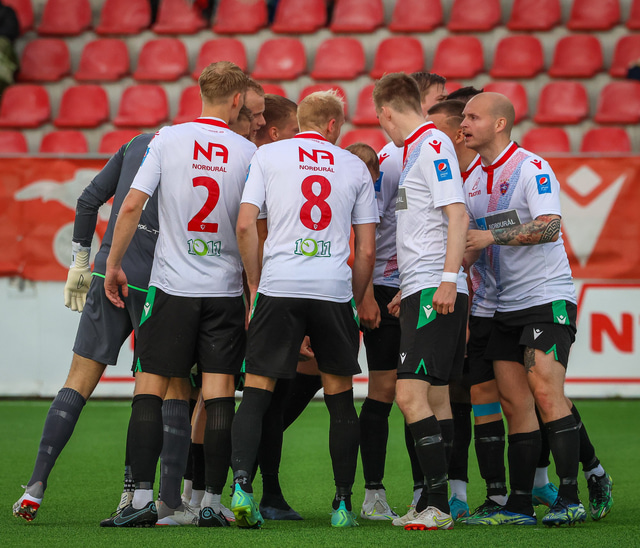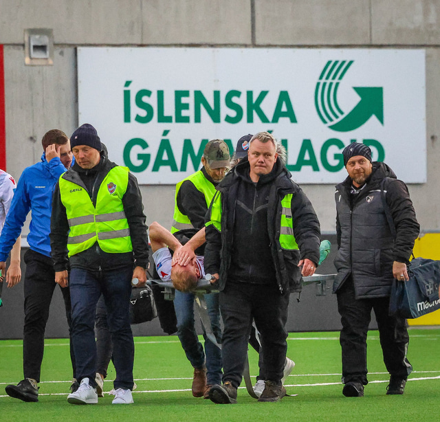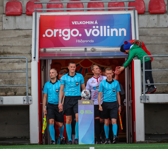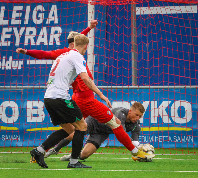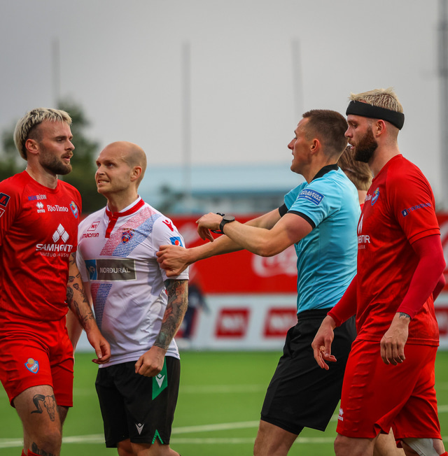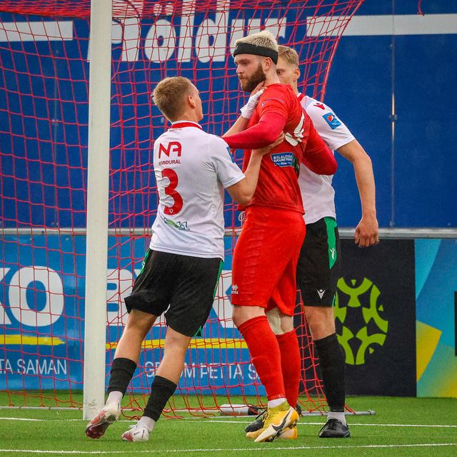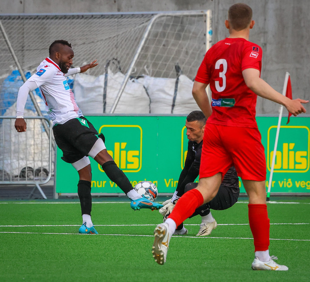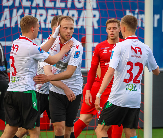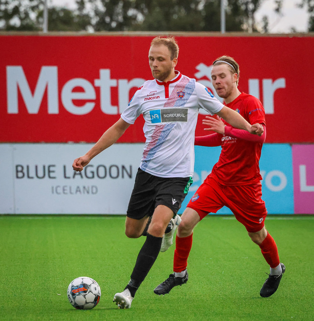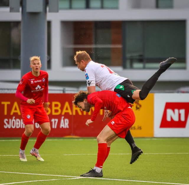 Jú fyrirsögnin er hárrétt, Haukar léku heimaleik á Origo-velli Vals á Hlíðarenda gegn Njarðvík í 2. deild karla í gær þar sem félagið er að skipta um gervigras á Ásvöllum í Hafnarfirði. Gunnar Oddur Hafliðason dómari er litblindur og samþykkti því ekki að Njarðvíkingar spiluðu í grænum búningum gegn rauðum búningum Hauka. Því þurfti að fá lánað varabúningasett frá Val sem Njarðvík lék í. Það virtist happafengur því þeir unnu leikinn 1 - 2. Hér að neðan er myndaveisla úr leiknum.