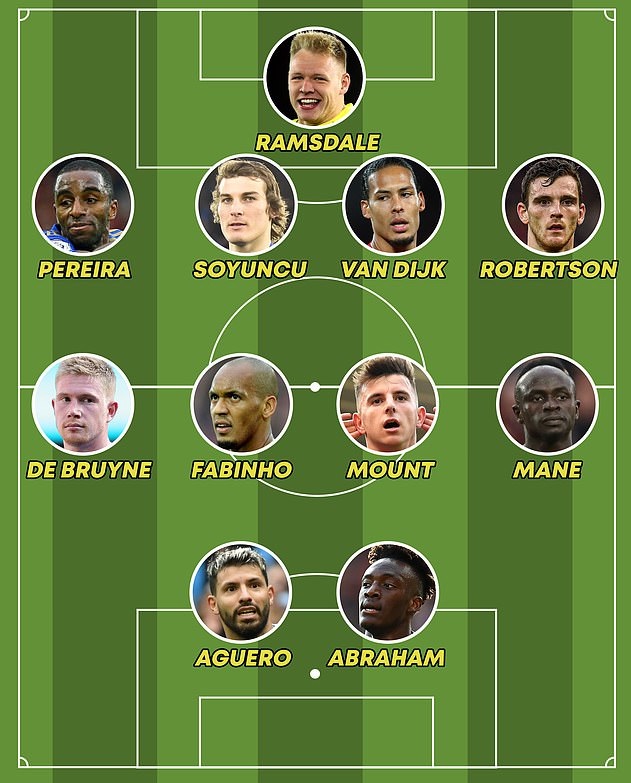 Þá eru tveir spennandi ungir leikmenn hjá Chelsea í liðinu. Mason Mount er klárlega að læra mikið af stjóra sínum, Frank Lampard. Svo er það sóknarmaðurinn Tammy Abraham sem er markahæstur í deildinni ásamt Aguero.