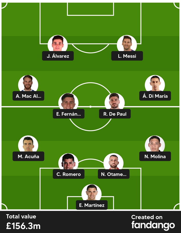 Argentína: Martinez, Molina, Romero, Otamendi, Tagliafico, De Paul, Fernandez, Mac Allister, Messi, Di Maria, Alvarez