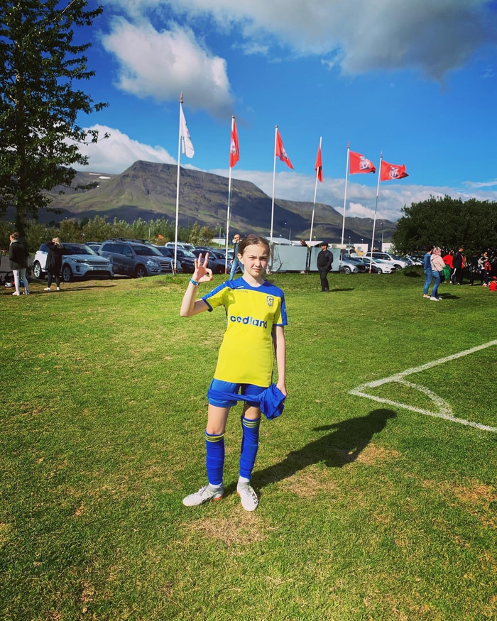 Natalía er aðeins tólf ára gömul og var hún þarna að mæta leikmönnum sem sumir voru allt að 21 árum eldri en hún. Elsti leikmaðurinn í liði Grindavíkur var hins vegar einungis 22 ára gömul og því mjög ungt lið sem mætti þar til leiks.