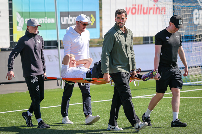 Arnór Borg Guðjohnsen hafði legið meiddur bak við endalínuna í dágóðan tíma og notið aðhlynningar þegar flautað var af. Við lokaflautið fékk framherjinn Kristoffer Grauberg höfuðhögg.