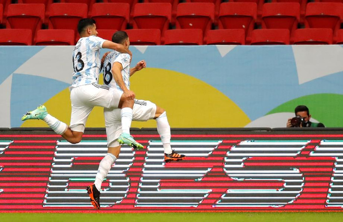 Sigurmarkið kom snemma leiks. Argentína fékk hornspyrnu sem Rodrigo De Paul tók en hann lagði boltann út á Messi sem kom með frábæran bolta á fjærstöngina. Þar var Rodriguez mættur og stangaði hann boltann í stöng og inn.
