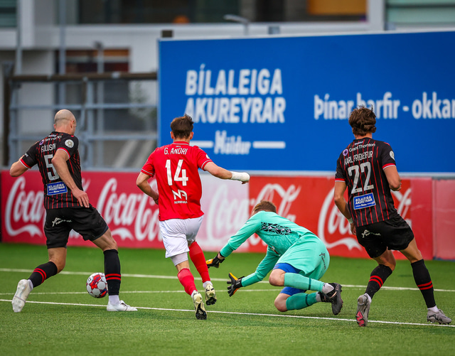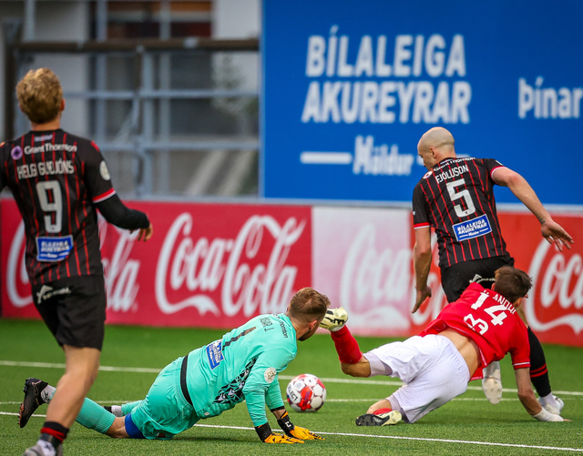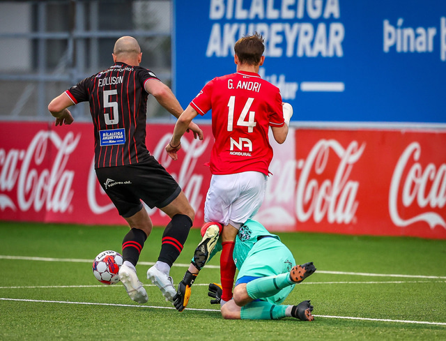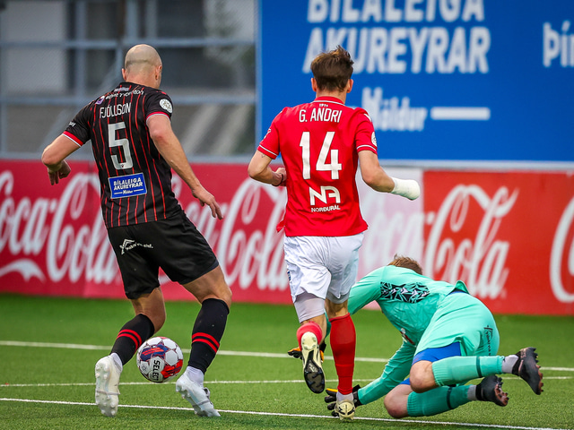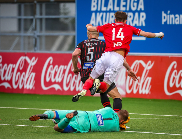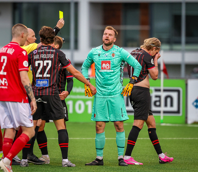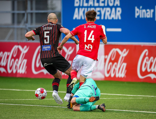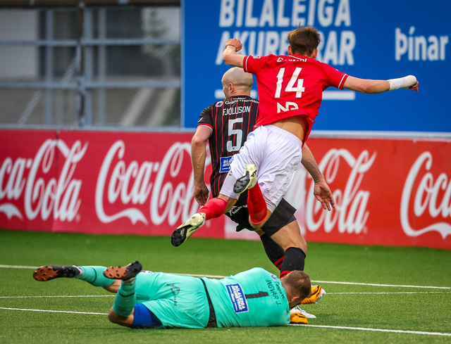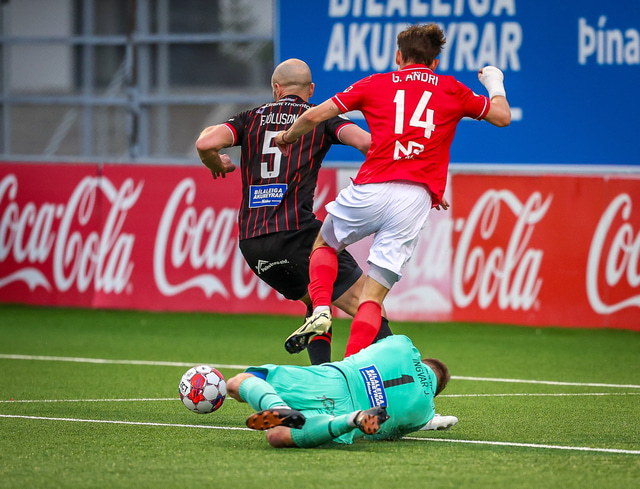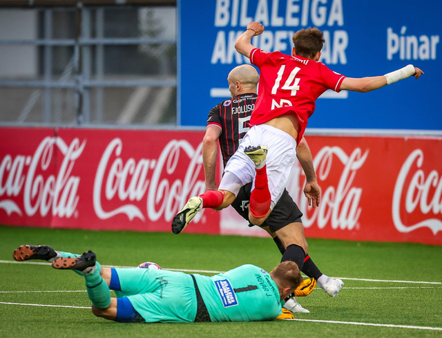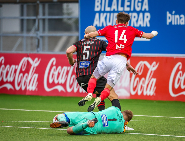 Meðfylgjandi í fréttinni eru nokkrar myndir af því þegar Ingvar Jónsson brýtur á Guðmundi Andra Tryggvasyni en Jón Guðni Fjóluson var með fullt vald á boltanum á sama tíma.