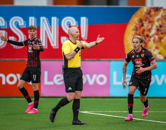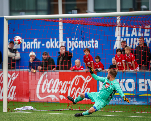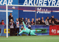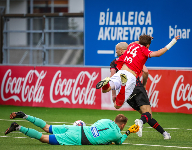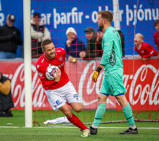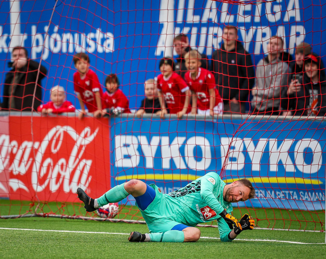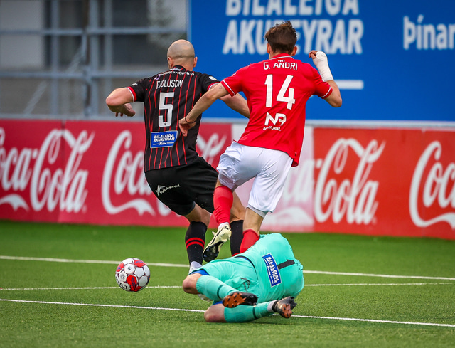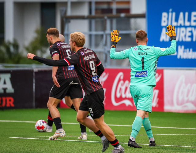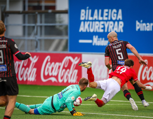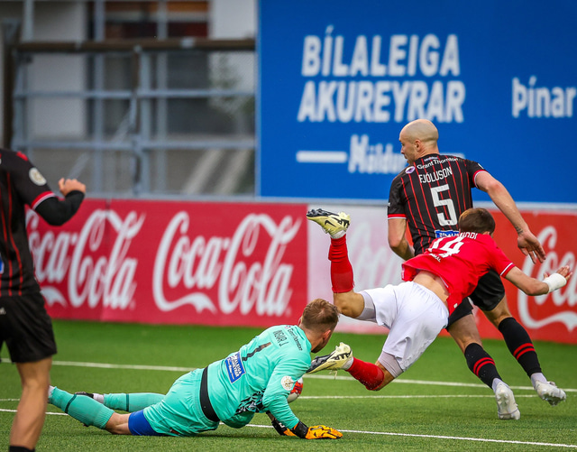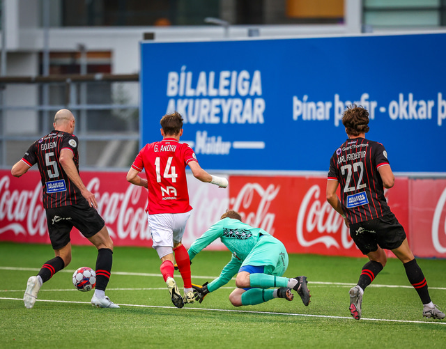Meðfylgjandi í fréttinni eru nokkrar myndir af því þegar Ingvar Jónsson brýtur á Guðmundi Andra Tryggvasyni en Jón Guðni Fjóluson var með fullt vald á boltanum á sama tíma.