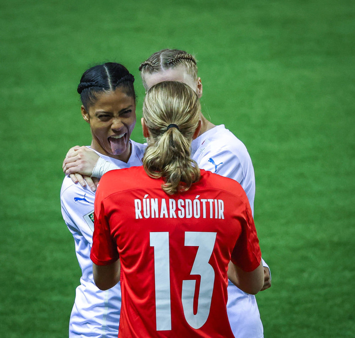 „Voða lítið," sagði hreinskilin Sveindís sem brosti þegar hún var spurð hvort hún vissi hvernig Þjóðadeildin virkaði. Keppnisfyrirkomulagið er ekki það einfaldasta. „Ég veit bara að við þurfum að vinna leikina. Ég er ekkert mikið að pæla í öðru, en við auðvitað förum í alla leiki til að vinna."
