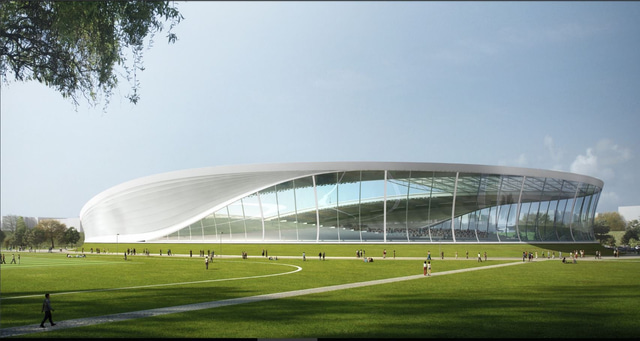 Sama mynd og að undan nema hér er búið að setja þakið yfir völlinn. Þakið væri færanlegt og hægt að nota þegar þarf.