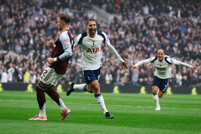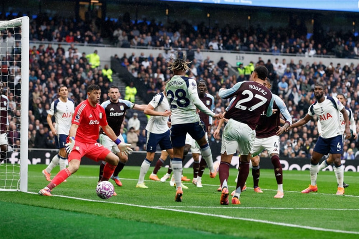 Villa-menn voru í vandræðum með að hreinsa frá eftir horn og var það Joao Palhinha sem kom boltanum aftur fyrir markið með skalla og á Bentancur sem fékk boltann í teignum og var nóg fyrir hann að stýra honum þéttingsfast á markið og í netið fór boltinn.