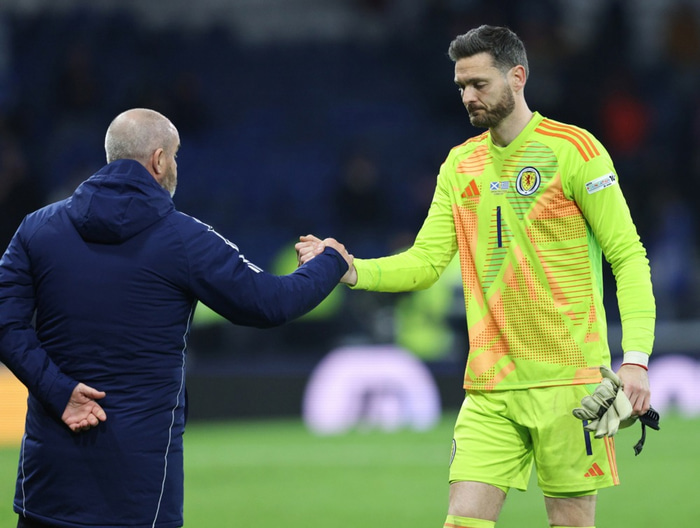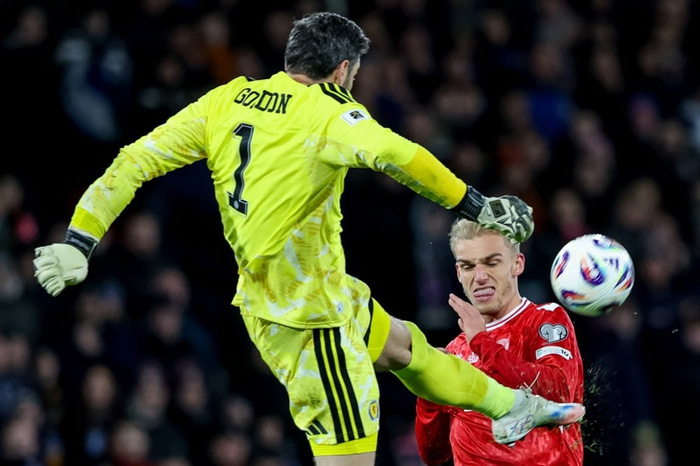 Craig Gordon varði mark Skotlands í leiknum gegn Dönum í undankeppni HM í gær. Skotar unnu leikinn á dramatískan hátt og eru á leið á HM í fyrsta sinn í 28 ár.