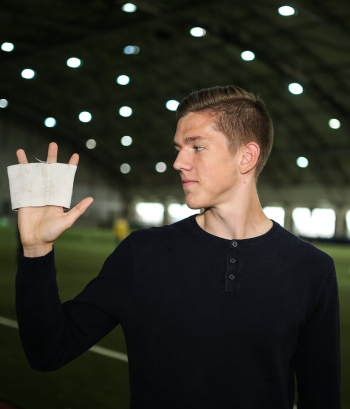 „Ég er að æfa langar og stuttar sendingar, skallabolta, fótavinnu, rekja bolta og alls konar. Ég byrjaði á þessu í fyrrasumar. Þá vorum við þrír eftir æfingar í aukaæfingum, ég, Ægir Jarl Jónasson og Jökull. Síðan voru oft fleiri ungir strákar með okkur.“