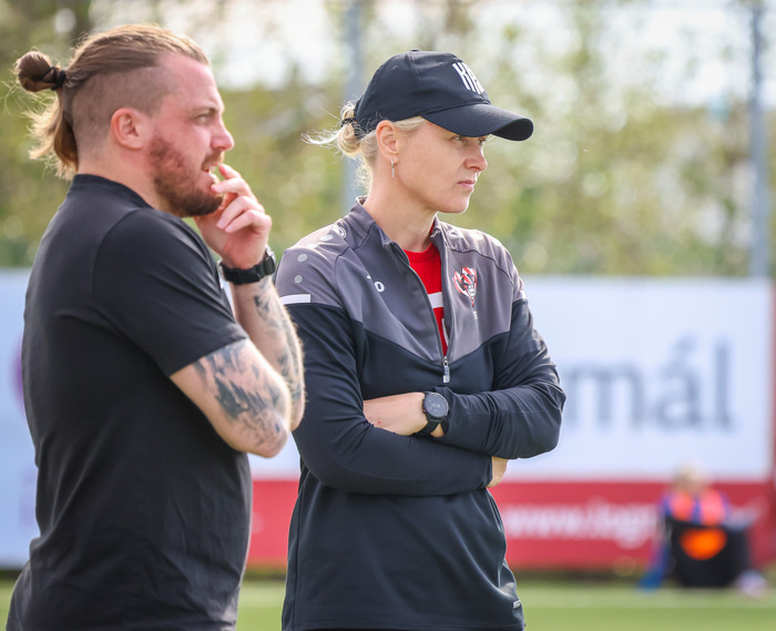 „Ég hef haft marga góða þjálfara. Ég get ekki sagt að einhver sé besti þjálfarinn. Þjálfarar eru með svo marga mismunandi kosti og galla. Nik er ógeðslega góður taktískt og er ótrúlega góður í því að kenna manni fótbolta. Svo ertu til dæmis með Möggu Magg, sem er að þjálfa U19 landsliðið. Hún var að þjálfa mig upp alla yngri flokkana í Val og það sem hún er með er að hún fær þig til að trúa á hluti sem þú hafðir ekki einu sinni látið þér detta í hug. Eins og að koma U19 landsliðið á EM í fyrra. Það er ógeðslega hæpið að gera þetta en henni tókst að koma trú inn í hópinn. Ég held að hún hafi átt stóran þátt í hugarfarinu sem ég er með."