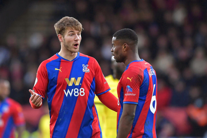 Í seinni hálfleik á Goodison Park í gær börðust þeir Dele Alli, leikmaður Everton, og Joachim Andersen, leikmaður Crystal Palace um boltann.