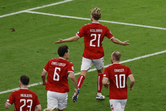 Danir svöruðu þessu marki Englendinga heldur betur vel og stundarfjórðungi síðar skoraði Morten Hjulmand frábært mark. Hann skoraði sitt fyrsta landsliðsmark með þrumuskoti fyrir utan teig, óverjandi fyrir Jordan Pickford í marki Englendinga.