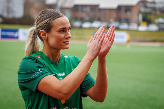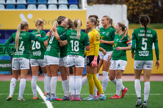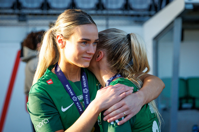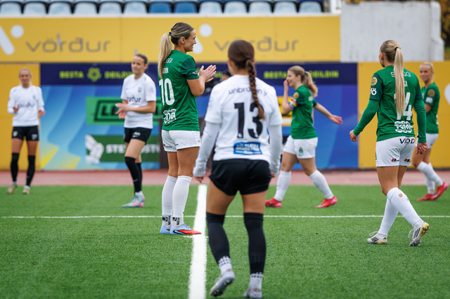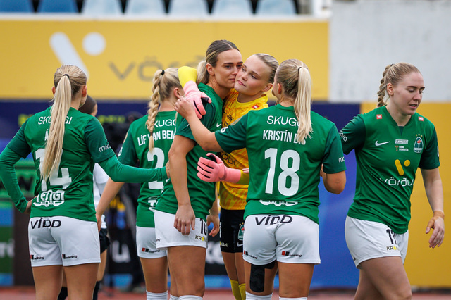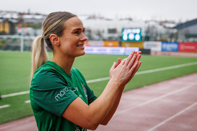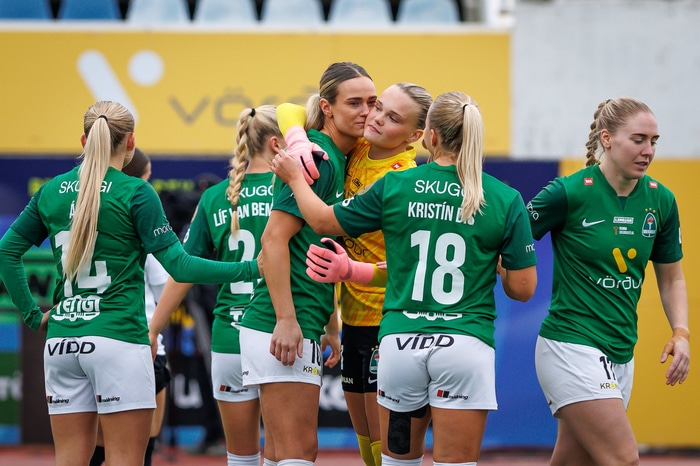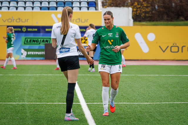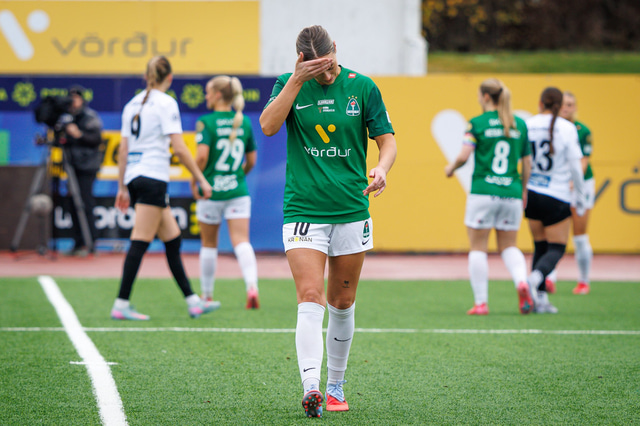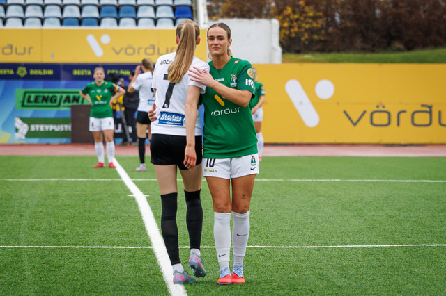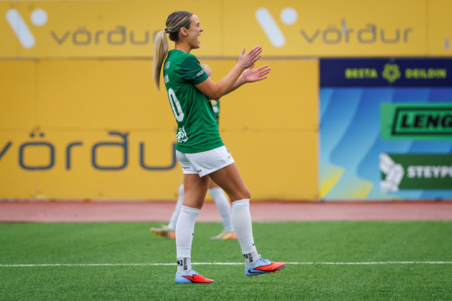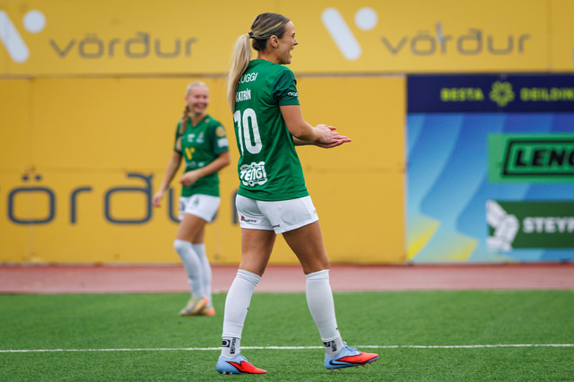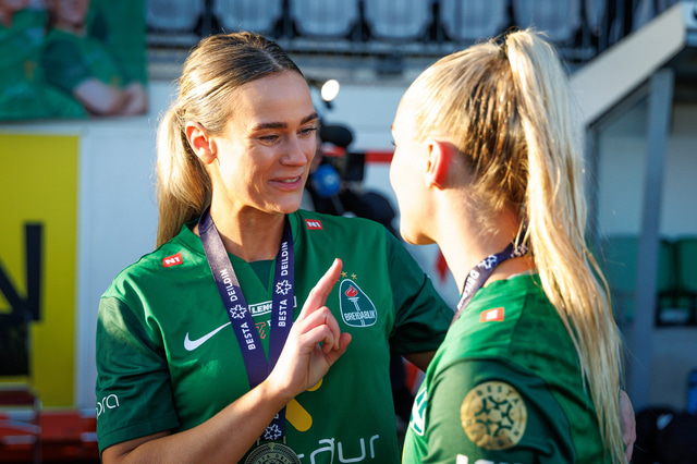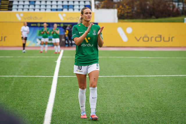 Eftir leik lyfti hún svo Íslandsmeistaraskildinum í annað sinn en alls hefur hún orðið Íslandsmeistari fjórum sinnum.