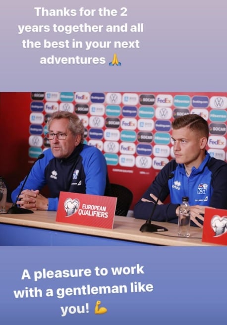 Landsliðssóknarmaðurinn Alfreð Finnbogason kveður Erik Hamren á Instagram. Hamren er hættur sem landsliðsþjálfari Íslands.