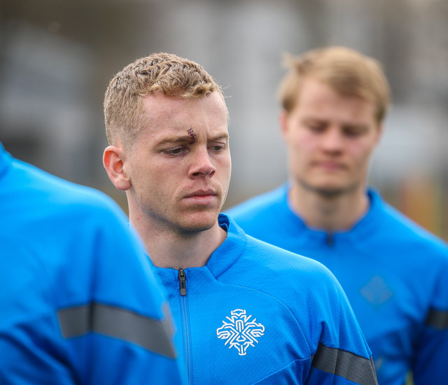 Sævar Atli fékk slæman skurð á höfuðið og þurfti að sauma hann átta sporum í höfuðið, sárin eru augljós á höfði hans. Alfreð Finnbogason hvíldi á æfingu liðsins í gær en mætti á æfingasvæði Bayern Munchen í dag og þá með myndarlegt glóðarauga.