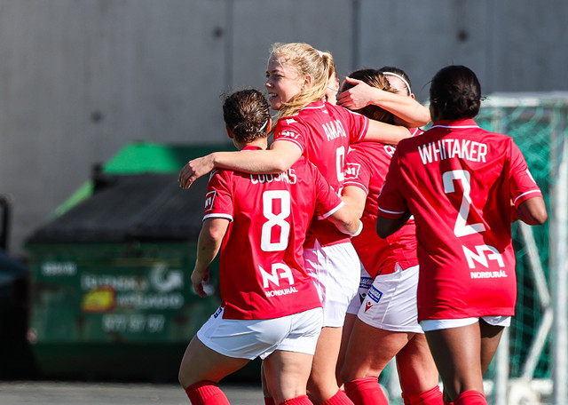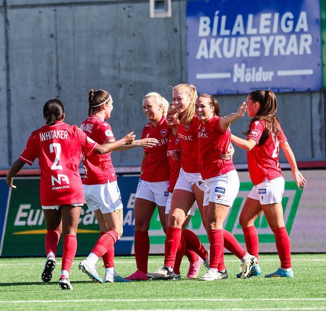 Þremur mínútum síðar gerði hún annað mark sitt er hún lét vaða fyrir utan teig. Óverjandi fyrir Hörpu. Amanda er í leit að þrennunni og var hún nálægt því að fullkomna hana þremur mínútum eftir annað markið en skalli hennar rétt yfir markið.