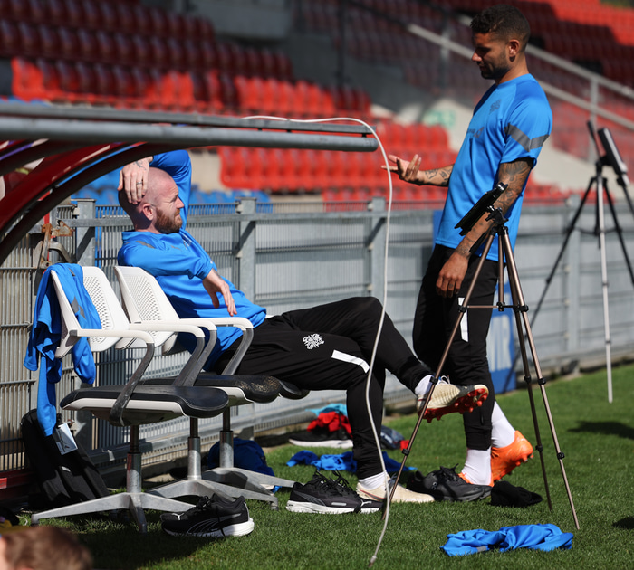 Allir leikmennirnir í hópnum taka þátt í æfingunni, þar á meðal markvörðurinn Hákon Rafn Valdimarsson sem kallaður var inn eftir að Elías Rafn Ólafsson varð fyrir höfuðmeiðslum á æfingu.