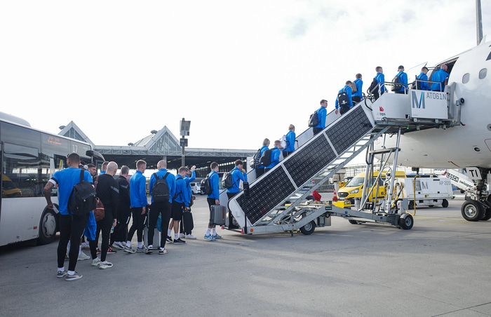 Íslenska liðið skilaði sér seinna til Bosníu en áætlað var. Klukkutíma seinkun varð á því að vélin fór í loftið þar sem öryggisskoðun í München tók sinn tíma.