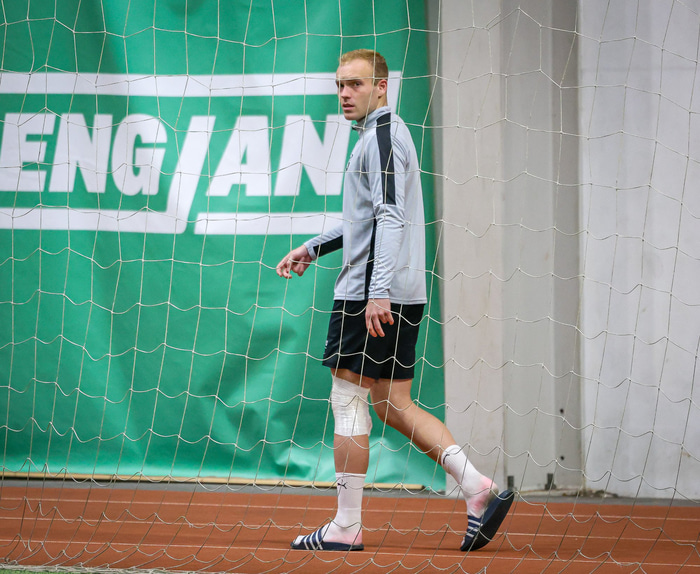 Óli sást í kjölfarið með vafning (sjá mynd) um vinstra hnéð. Hann verður væntanlega frá næstu 4-6 vikurnar þar sem innra liðband í hnénu er tognað. Hann segir við Fótbolta.net að hann vonist til að vera klár fyrr.