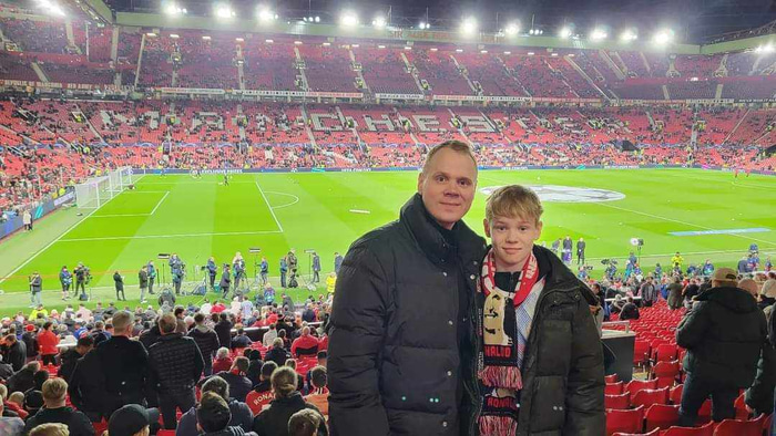 Stefán með syni sínum Gunnari Inga á Old Trafford, seinni leikur gegn Atletico Madrid í Meistaradeildinni sem endaði með 0-1 tapi.