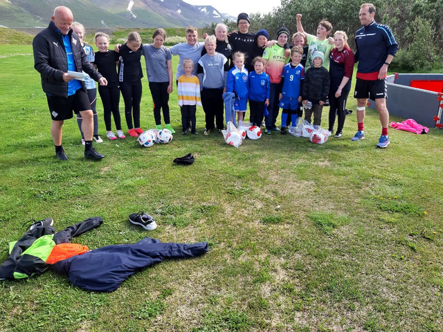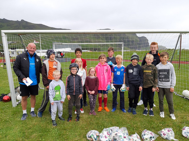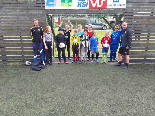 14 krakkar mættir (2 stelpur þurftu að fara aðeins fyrr með ömmu af æfingunni) Sigurður sér líka um allar æfingar hér líkt og á Kirkubæjarklaustri. Pönnuvöllurinn á fullu og krakkarnir mjög áhugasamir um fótbolta og pönnuvöllinn. Frábær staður, mikil fegurð og krakkarnir agaðir og flottir.
