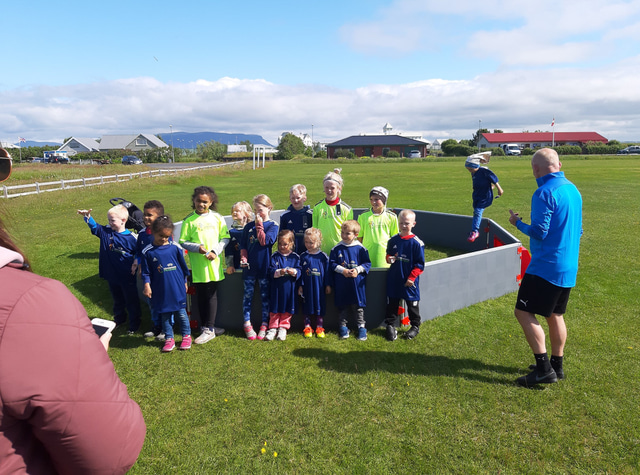 11 krakkar mættir og Jórunn (vantar Elvar Frey á myndina). Pönnuvöllurinn á fullu hjá krökkunum. Svo þegar krakkarnir voru búnir, þá hoppaði Jórunn (forráðamaður og foreldri) inn í með börnin sín og hætti ekki fyrr en ég gaf henni gula spjaldið. Æðislegir krakkar, frábær staður og Jórunn mögnuð. Gaman að segja frá því að þegar við vorum hætt þá kom fjölskylda og tók 20 mínútna æfingu á vellinum, pabbinn, mamman, og 2 eldri börn. Sá svo þessa fjölskyldu í morgunmat daginn eftir, svona líka skökk og hölt, marin og enn rjóð í kinnum, en gleðin var enn á andliti þeirra, já pönnuvöllur KSÍ er fyrir alla