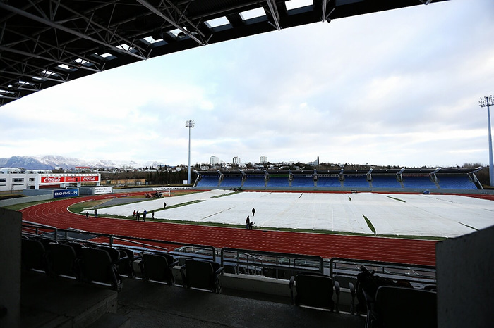 Dúkur yfir keppnisflöt Laugardalsvallarins dugar ekki ef snjóar. Það þarf þá að að fella hann niður, þannig að hann liggur undir snjó á vellinum, sem þarf síðan að moka af.