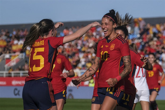 Jennifer Hermoso, Aitana Bonmati og Ona Batlle skoruðu mörk Spánverja.
