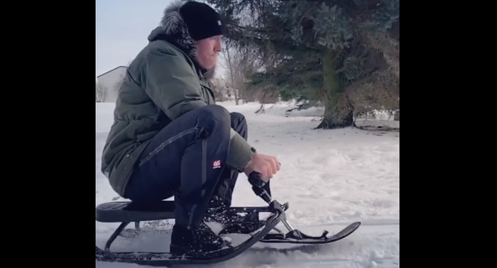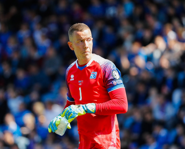 Hannes Þór Halldórsson landsliðsmarkvörður hefur birt myndband þar sem hann leikur sér á sleða úti í snjónum.