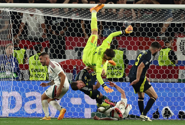 Ungverski sóknarmaðurinn Barnabas Varga var borinn af velli á börum eftir að hann lenti í óhugnanlegum árekstri við Angus Gunn markvörð Skotlands á EM í kvöld.