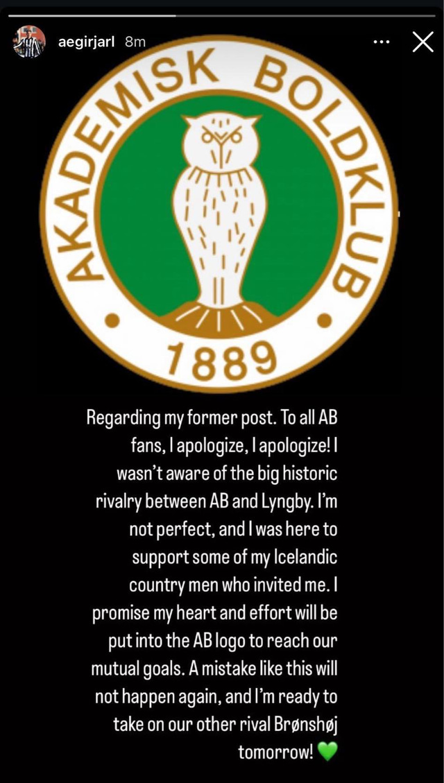 „Varðandi innlegg mitt. Þetta er til allra stuðningsmanna AB: Ég biðst afsökunar, ég biðst afsökunar! Ég þekkti ekki þennan sögulega ríg sem er milli AB og Lyngby," skrifaði Ægir á Instagram.