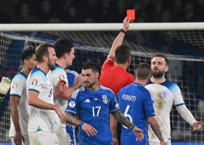 Luke Shaw, vinstri bakvörður enska landsliðsins gegn Ítalíu í gær, fékk að líta tvö gul spjöld á mínútu kafla þegar skammt var eftir af leiknum, þar með rautt. England leiddi þá 1-2 í Napoli og urðu það lokatölur leiksins.