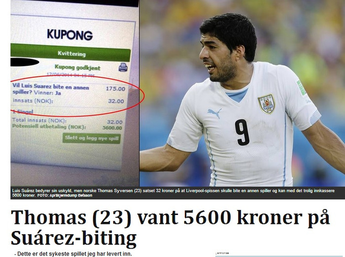 Norðmaðurinn Thomas Syversen er um 105 þúsund íslenskum krónum ríkari eftir að hafa veðjað á að Luis Suarez myndi bíta andstæðing í leik Úrúgvæ og Ítalíu í dag.