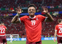 Antonio Rudiger varnarmaður þýska landsliðsins meiddist á læri þegar hann fagnaði jöfnunarmarkinu gegn Sviss í gær.