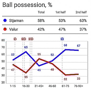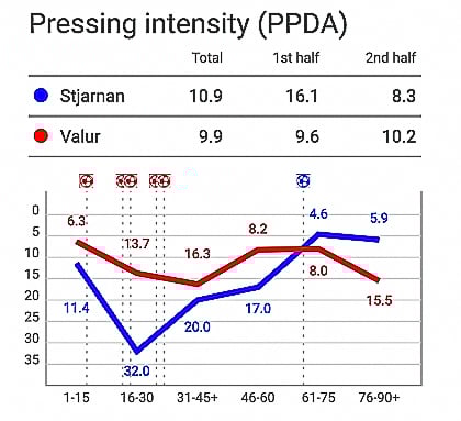 Valsmenn byrjuðu leikinn gegn Stjörnunni af gríðarlegum krafti og pressuðu stíft á Stjörnumenn um allan völl í upphafi leiks. PPDA mælikvarðinn endurspeglar vel þessa sterku byrjun Valsmanna einkum þegar hann er settur í samhengi við fjölda skota á markið á fyrstu 30 mínútum leiksins.