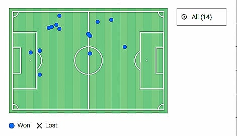 Enginn leikmaður í liði Vals vann boltann oftar en Valgeir Lunddal og myndin að ofan sýnir á hvaða svæðum hann var að vinna boltann. Valgeir er að lesa leikinn vel og styðja vel við pressuna þegar liðið er hátt sem og hliðarfærslur varnarinnar. Mjög skemmtilegur og fjölhæfur leikmaður.
