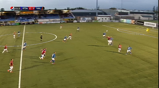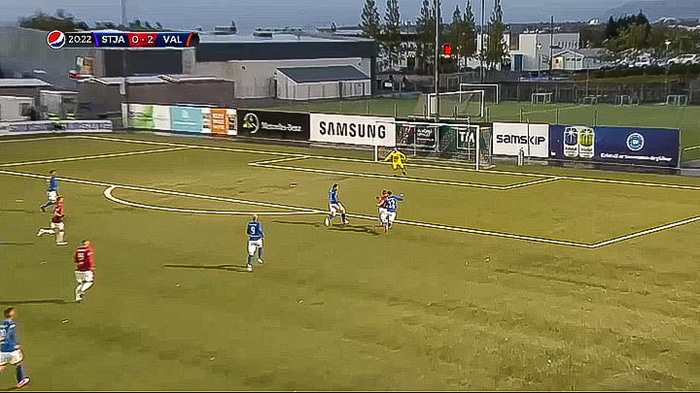 Varnarleikur Stjörnunnar, en einkum Daníels Laxdal, er hálf kómískur í stað þess að standa á ská og vera tilbúinn til að takast á við hlaupið stillir hann sér upp eins og keilu. Snýr beint fram og á aldrei möguleika á að verjast sökum þess.