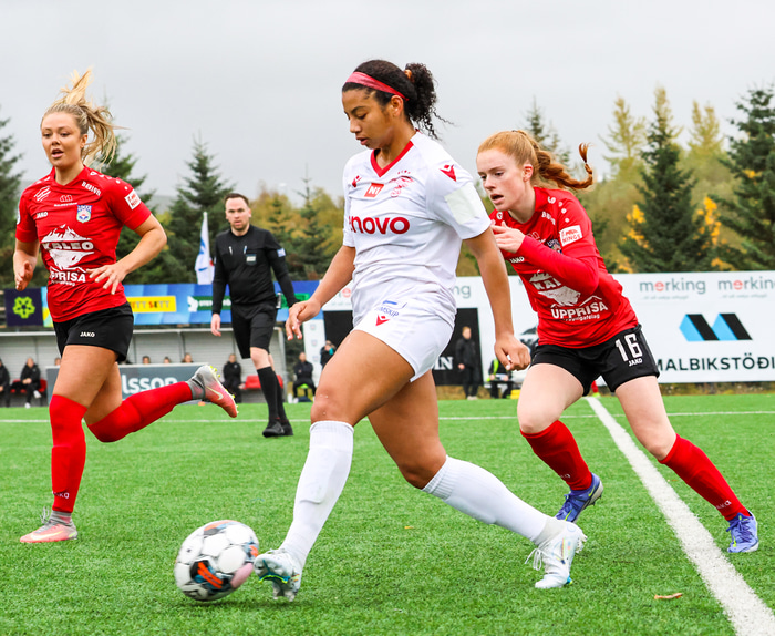 Valur komst í tveggja marka forystu í opnum og skemmtilegum fyrri hálfleik þar sem Cyera Hintzen og Anna Rakel Pétursdóttir skoruðu mörkin eftir laglegan undirbúning frá Þórdísi Hrönn Sigfúsdóttur. Mörkin voru keimlík en Guðrún Elísabet Björgvinsdóttir var ekki lengi að minnka muninn.