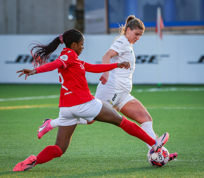 „Það væri auðvitað gaman, alltaf gaman að búa einhvers staðar annars staðar. Það væri líka gaman að spila bara fótbolta, ég hef alltaf annað hvort verið í skóla eða að vinna með boltanum. Það væri mjög gaman að geta bara einbeitt sér að fótboltanum. En ég ætla núna bara að einbeita mér að þessu landsliðsverkefni, fer svo að æfa og horfi á næsta tímabil eins og staðan er núna. Augun eru á Meistaradeildinni, að komast lengra þar, ég horfi mest á það akkúrat núna."