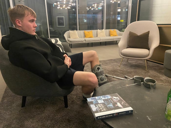 Benoný var í hlífðarskó og á hækjum vegna ökklameiðsla sem hann varð fyrir í janúar. „Staðan er fín, ég var í gifsi í tvær vikur og fór úr því í gær. Ég er hægt og rólega byrjaður að labba aftur, strax betri í dag en ég var í gær. Það styttist í að ég losni við hækjurnar. Ég verð í hlífðarskónum í um fjórar vikur. Ég má svitna, gera ökklaæfingar, þarf bara að vera í skónum þegar ég er ekki í því."