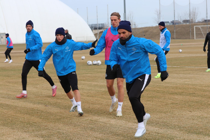 Á myndum frá fyrstu æfingu íslenska liðsins í Toronto frá því í gær má sjá strákana okkar kappklædda í nöpru loftslaginu.