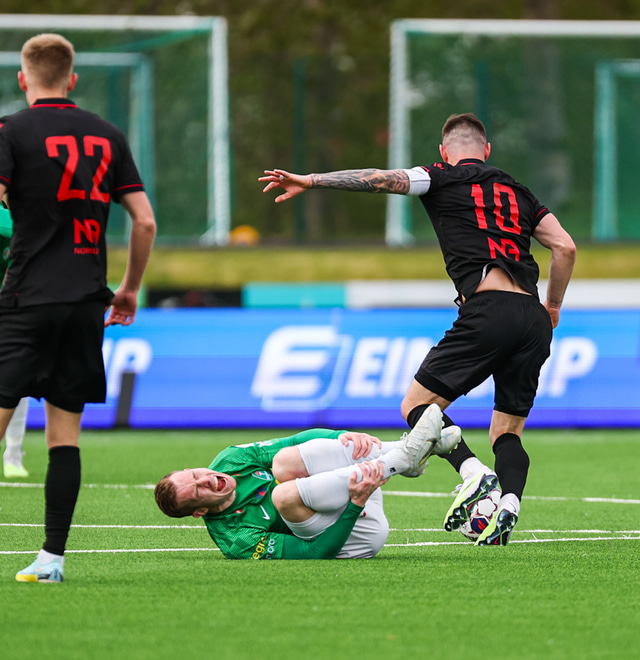 Framherjinn knái er með 7 mörk í Bestu deildinni á tímabilinu og er markahæstur en hann fór meiddur af velli á 79. mínútu. Eftir að hann var kominn af vellinum þurfti hann á börum að halda.