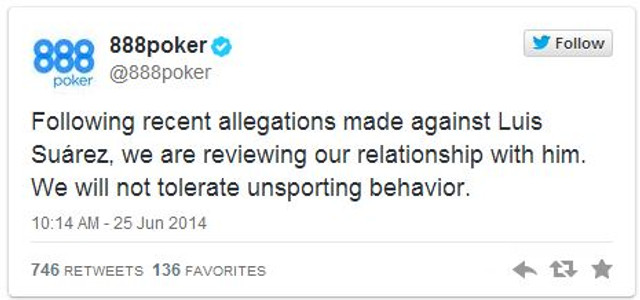 Pókerfyrirtækið 888 hefur ákveðið að endurskoða samstarfssamning sinn við Luis Suarez eftir að Úrúgvæinn beit Giorgio Chiellini í gær.