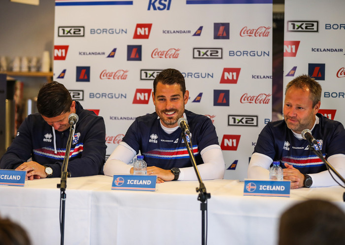 Freyr Alexandersson, landsliðsþjálfari kvenna, Ásmundur Haraldsson aðstoðarþjálfari og Ólafur Pétursson markmannsþjálfari sátu fyrir svörum á fréttamannafundi í gær.