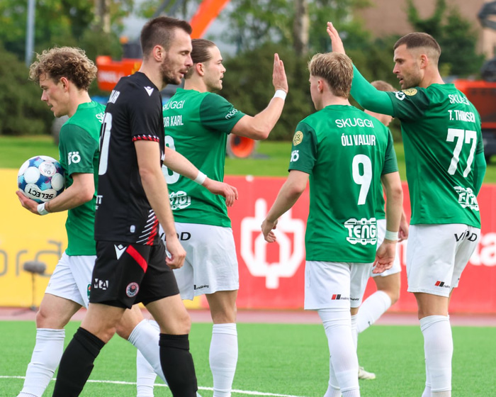 „Allan tímann var ég með í hausnum að þetta færi þá 5-1. Heyrðu, þeir spila þá bara sama leik þarna og maður hefur séð í sumar; á þriðja þriðjungi skora þeir bara ekki. Mörkin eru þannig að boltinn fer af varnarmanni og inn og víti sem á ekki að vera vítaspyrna. Þetta er á móti liði sem myndi ekki vinna 2. deildina," sagði Valur jafnframt.