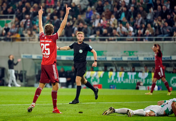 Þýski landsliðsmaðurinn Thomas Müller náði merkum áfanga í gær er hann skoraði fyrsta mark Bayern München í 3-1 sigri á nýliðum Greuther Fürth.